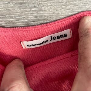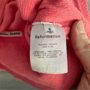 Pink crop top from Reformation. Women’s size small, good pre owned condition. Material likes to stick to itself.