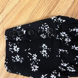 Chic and stylish black top from Reformation with a delicate floral pattern. Perfect for any occasion. Size 2. Cropped top with ruching in the back that’s not super visible, but makes for extra stretch and comfort. VSCO blend. Buttons on the sleeve with an extra button (sea label picture). Invisible side zip. Only a war a few times and in great condition.
