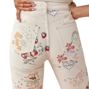 Reformation Cynthia High Rise Straight Jeans in Doodle Wash (off white with all over colorful drawings & eco-conscious quotes)