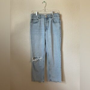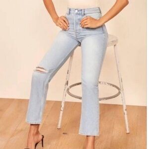 Reformation Cynthia high rise straight leg jeans in Tahoe destroyed wash. Excellent pre-owned condition with no noticeable flaws!