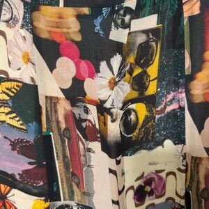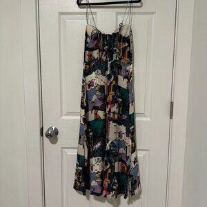 Corset top midi dress with ruched back, tie straps, and thigh slit. Coolest collage print ever.