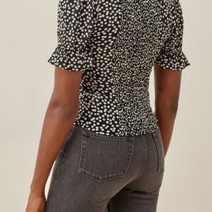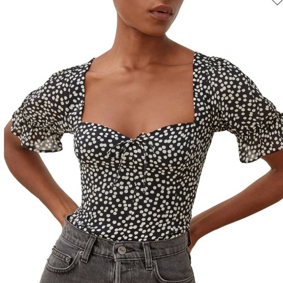 Puffed, frill-trimmed sleeves frame this full-of-charm top designed with a dipped sweetheart neck and shapely cropped fit.