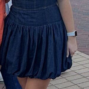 Wear the dress. Shop the Delia Denim Mini Dress from Reformation, a sleeveless mini dress with a drop waist, seam detailing at the bodice, and a bubble skirt.