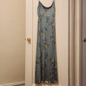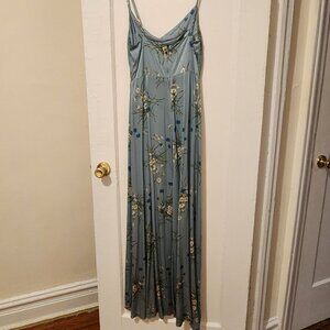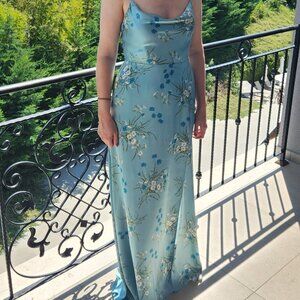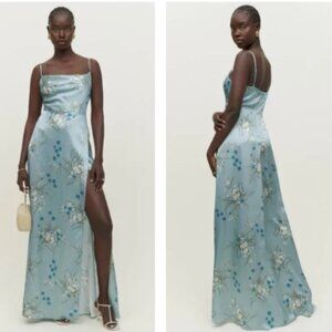 Reformation Devora 100% Silk Dress Size 6. Maxi (full) length, light blue with white and blue flowers, and high slit. Only worn once as wedding guest.