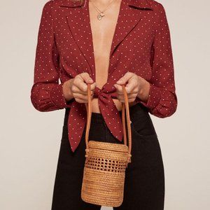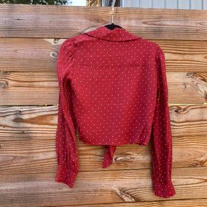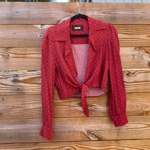 Reformation Dottie top in brick red subtle polka dot pattern called dita, with Center front tie, Cropped, Long sleeve, Notched lapel. Soft ref fabric.