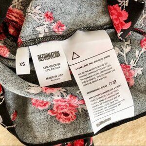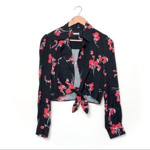 Reformation Dottie top in a lovely red and black floral print. This is a cropped, open front top with a center front tie and notched lapels.