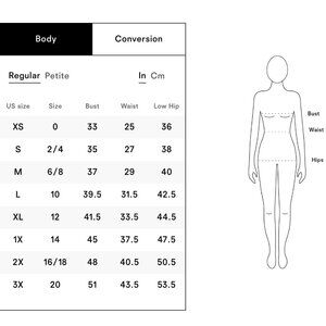 The model is wearing a size XS and is 5'9", 24" waist, 34" hips, 32" bust.