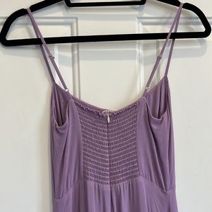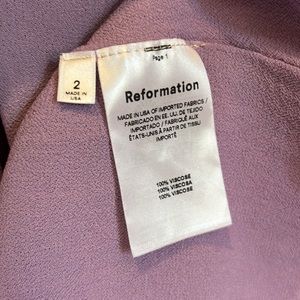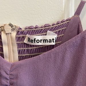 Great condition Reformation Emersyn dress features adjustable spaghetti straps and back zipper closure. Was used for a wedding and then dyed to its current lavender color for use at another event.