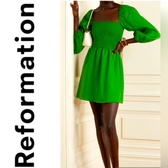 Tags: reformation, linen, Greyson, shirred, smocked, mini, green, dress, XL, plus