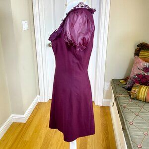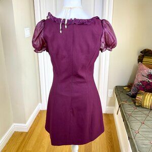 Beautiful burgundy babydoll mini dress with sheer puff sleeves, scoop neck with lace trim and black bow, wool blend, back zip
