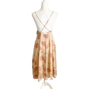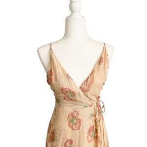 Crafted from soft viscose, this dress features a wrap-front silhouette with a self-tie adjustable waist, strappy open back, and delicate spaghetti straps. The muted blush-pink floral print adds subtle vintage charm, while the lightweight fabric moves beautifully with every step.