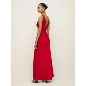 Reformation Elaina Satin Dress in Lipstick. Size 2. Features double satin fabric, long maxi length, fitted at bodice, deep v neck, v back, sleeveless, center front slit, and buttons along the front, lined, back zipper with hook and eye closure. 88% NAIA renew acetate, 12% polyester. Style 1315036. NWOT / New without tags. Retail $398.