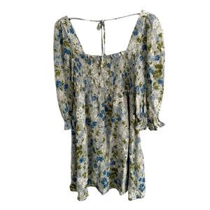 Charming floral dress with puff sleeves. Features a tie-back design. Perfect for a casual outing.
