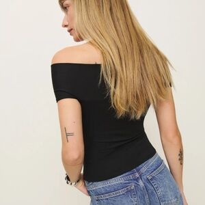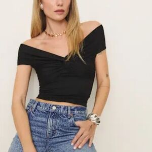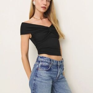 Who, me. Shop the Ezlynn Knit Top from Reformation, an off-the-shoulder, short sleeve top with a center front twist and ruching at the bust.