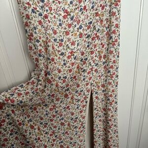 Elegant floral maxi dress. Square neckline. Side slit detail. Perfect for any occasion.