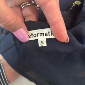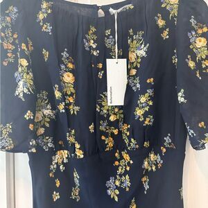 Elegant navy maxi dress with floral print. Features short sleeves and a fitted waist. Perfect for any occasion. Slip on dress with pretty buttons on the back. Belt not included.