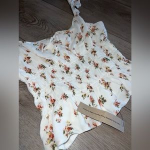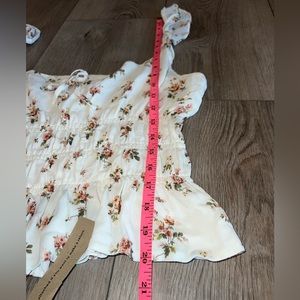 Beautiful light tank top. Cream with pink and green floral design. Ruffles on the straps, ruching at the stomach. New with tag still attached. No holes or stains. Would make a great layering piece or alone on warm days! Please see all photos and video for condition and measurements.