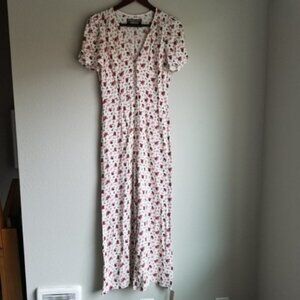 This is a button front jumpsuit with slightly puffed shoulders and a wide leg.
