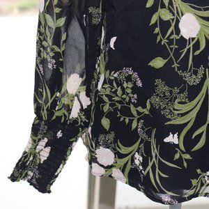 Beautiful blouse that has smocking at the turtleneck and cuffs with puffed raglan sleeves. Back has a keyhole with button and loop closure.