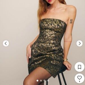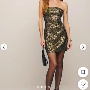 In a beautiful black and gold color. • Fabric: Lightweight, non-stretch brocade • Smocked elastic panel at back • Bodice boning at side seams • Strapless with non-slip rubber binding Hidden zip at back