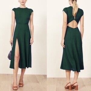 Reformation Gavin Midi Dress Open Back Cap Sleeve Emerald Green Slit Size 4