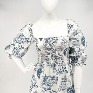 Effortlessly romantic, the Reformation Gitane Linen Midi Dress in Corsica is crafted from 100% linen for a breathable, lightweight feel. This dress features a charming blue-and-white floral print, puff sleeves with elastic cuffs, and a smocked bodice for a flattering, flexible fit. The side slit adds a feminine touch to this timeless silhouette — perfect for brunch, vacations, or garden parties.