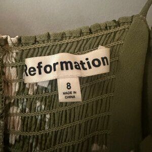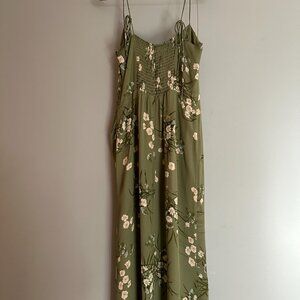 Elegant green midi dress with floral pattern. Features a fitted bodice and side slit. Perfect for any occasion.