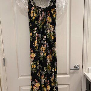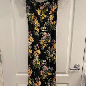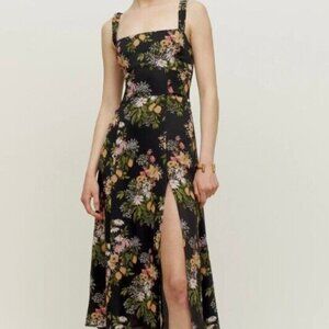 Elegant midi dress with floral pattern. Green base with orange highlights. Features a square neckline and sleeveless style. Ideal for casual wear.