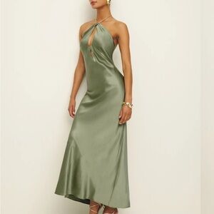 This elegant green dress by Reformation is perfect for a cocktail event, featuring a sleeveless halter neckline and a sleek slip style. The backless design adds a captivating element, while the luxurious fabric drapes beautifully for a refined look.