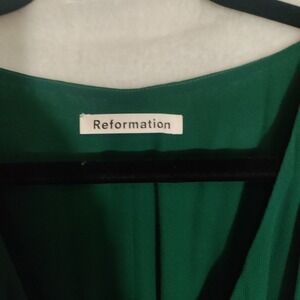 The product is a Reformation green long sleeve V-neck maxi dress in size small. This elegant and stylish dress features a solid green color, long sleeves, and a flattering V-neckline. It is suitable for occasions like weddings and parties, making it a versatile and chic addition to any woman's wardrobe. The long dress length adds a touch of sophistication, while the brand's reputation ensures quality and on-trend style.