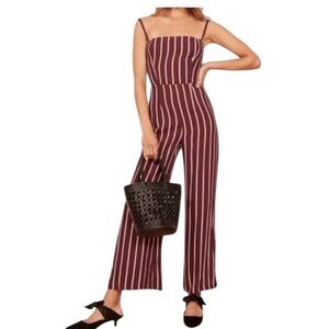 Vertical stripes set the silhouette to slimming in this body-con jumpsuit held up with skinny straps.