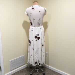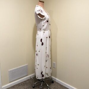 Excellent condition no stains rips or fading. Short sleeve, v-neck, wrap midi dress. Ruffle around the neck and sleeves. Red and yellow flowers.