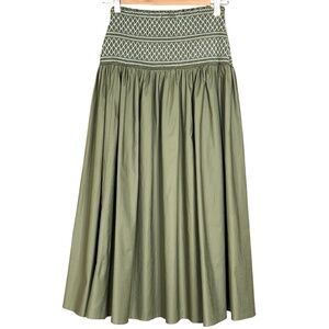 Midi skirt that has an A-line shape and smocking at the waist