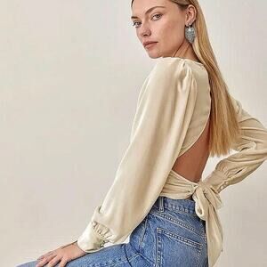 Reformation Henning Velour Velvet Women's Cream 100% Rayon Long Sleeve Knotted Tie Open Back V-Neck Crop Blouse Button Top