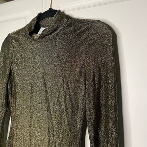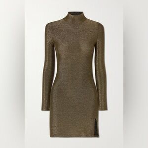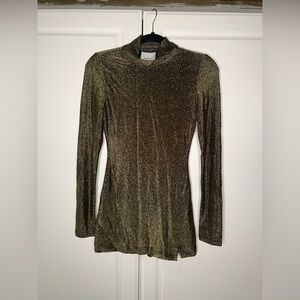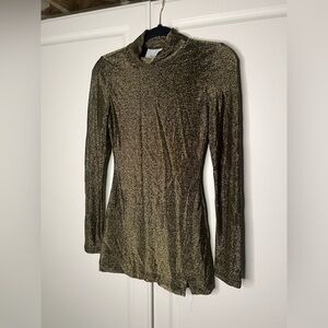 Fitted turtleneck mock neck mini dress with a small front slit. Stretch material. Gold and black metallic knit with deadstock fabric. Size small