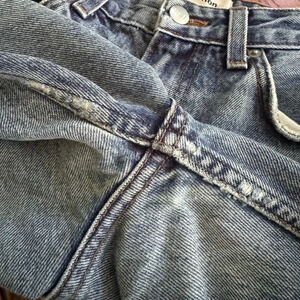 Note - actual Jean has only distressed knees, hems, and pocket edges. Some minor distressing at crotch seams (see photos)