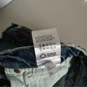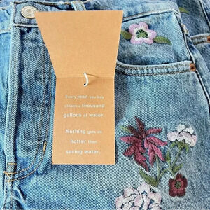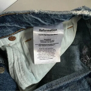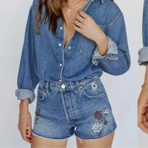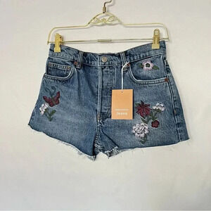 Reformation High Waisted Charlie Jean Denim Shorts Fauna Embroidery Blue Raw Hem