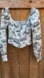 Features: Puffed, frill-trimmed sleeves frame this cropped front-button top styled with shapely back smocking. Front button closure, sweetheart neck, long sleeves with 3 button detail at cuffs. Elastic at shoulders. Hip length Super cute French-inspired toile print with white and blue horse pattern similar to Reformation's Britannia pattern in other pieces. Made in the USA
