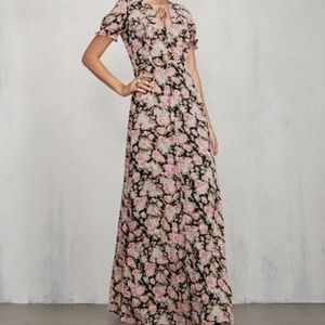 The Huntington Dress is what a lady should wear, well what a cool lady should wear. This is a georgette maxi dress with a tied V neckline and ruffle detailing along the front and sleeves. Fitted through the bodice and waist then the skirt goes a bit fuller. The back is sheer with a hook/zip closure. Lucky to be a lady. Made from 100% viscose.