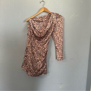 100% silk in a leopard print. Mini dress in a one shoulder style. Draped details. Unlined. Some spots on sleeve that will most likely come out with cleaning, shown in last two photos, otherwise good condition