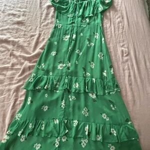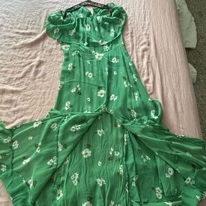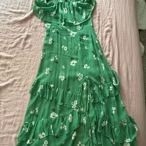 Chic strapless dress by Reformation. Features a green floral pattern. Perfect for summer occasions.