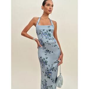 Reformation Ivan Silk Dress Fresh Air. Size 8. Features floral print throughout, square neckline, halter neck, sleeveless, thin strap down backless open back, lined, zipper with hook and eye closure, long maxi floor length. 100% silk. Style 1318120FSA. Brand new, never worn, nwt, new with tags.