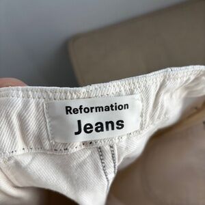 Elevate your style with these chic high-waisted cream jeans. Perfect for any occasion, these jeans offer a flattering fit and timeless design. These relaxed Reformation jeans manage to feel a bit different from the norm while still retaining plenty of polish. The patch front pockets look cute and classic, and subtle contrast stitching adds a little more definition to the silhouette.