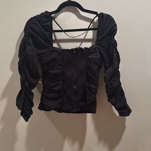 This elegant black ruched top is perfect for any occasion. Its sleek design offers a flattering fit, making it a versatile addition to your wardrobe. great condition , square neck line, ruched sleeves, zips in back, has some stretch.  Size tag missing but best for medium large. 16” ptp
