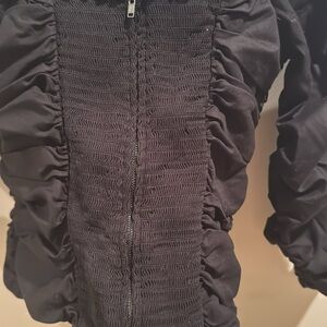 This elegant black ruched top is perfect for any occasion. Its sleek design offers a flattering fit, making it a versatile addition to your wardrobe. great condition , square neck line, ruched sleeves, zips in back, has some stretch. Size tag missing but best for medium large. 16” ptp