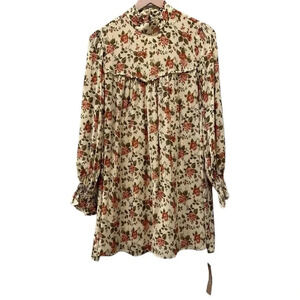 The Jourdan Dress from Reformation is a babydoll dress with a relaxed fit throughout. It has a high neckline and smocking at the sleeve opening.