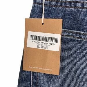 Blue jeans featuring a high rise, single button and zip fly, and ripped distressed details. Fitted throughout hip and butt with an easy fitting leg. Made from 100% non-stretch recycled materials. Feels like rigid denim though.