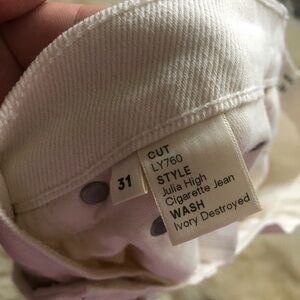 Color: destroyed ivory. Nonstretch denim jeans. Straight, slender leg. High waistline. Distressed trims.