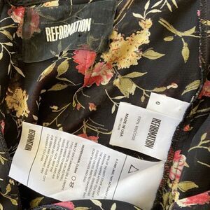 BY REFORMATION, HERE IS THEIR FABULOUS “MIRI” JUMPSUIT. IT IS 100% ECO-FRIENDLY VISCOSE AND DONE IN A BLACK BACKGROUND WITH A BEAUTIFUL FLORAL PATTERN IN DEEP PINK,WHITE AND GREEN OVER IT. THIS ADORABLE REF FEATURES AN OPEN TIE BACK WITH A BACK ZIP FROM THE WAIST. THERE ARE SOFT RUFFLES ON THE CAPPED SLEEVES AND A SCOOP NECK. THE LEGS ARE FLOWY. NWOT, SIZE 0, PLEASE NOTE THE MEASUREMENTS