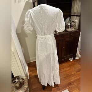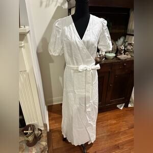 For whatever you do sunrise to sunset. Shop the Kaelie Dress from Reformation, a midi, adjustable wrap dress with slight puff sleeves and a v-neckline.